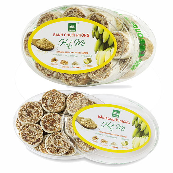 Thành phần: Chuối (50%), mè trắng (30%), đường, gừng, nước cốt dừa, bánh phồng.