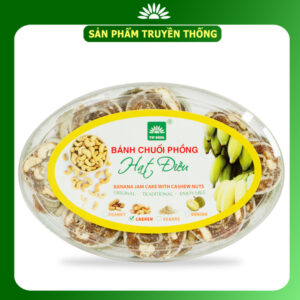 Thành phần: Chuối (50%), hạt điều (20%), đường, gừng, mè trắng, nước cốt dừa, bánh phồng.