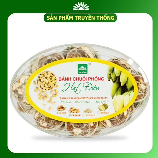 Chuối (50%), hạt điều (20%), đường, gừng, mè trắng, nước cốt dừa, bánh phồng.