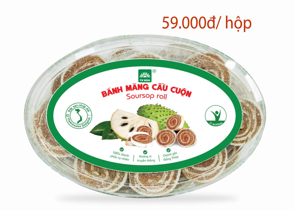 Với tiêu chí đảm bảo uy tín từ những sản phẩm ngon – sạch – tốt cho sức khỏe. Các loại bánh mứt của Tư Bông sử dụng nguyên liệu sạch, cam kết không dùng hóa phẩm màu, hạn chế sử dụng đường. Do vậy mà món bánh mãng cầu cuộn Tư Bông giữ được vị chua ngọt tự nhiên và vị dai của từng múi mãng cầu. Đúng chuẩn thương hiệu đặc sản Đồng Tháp.
