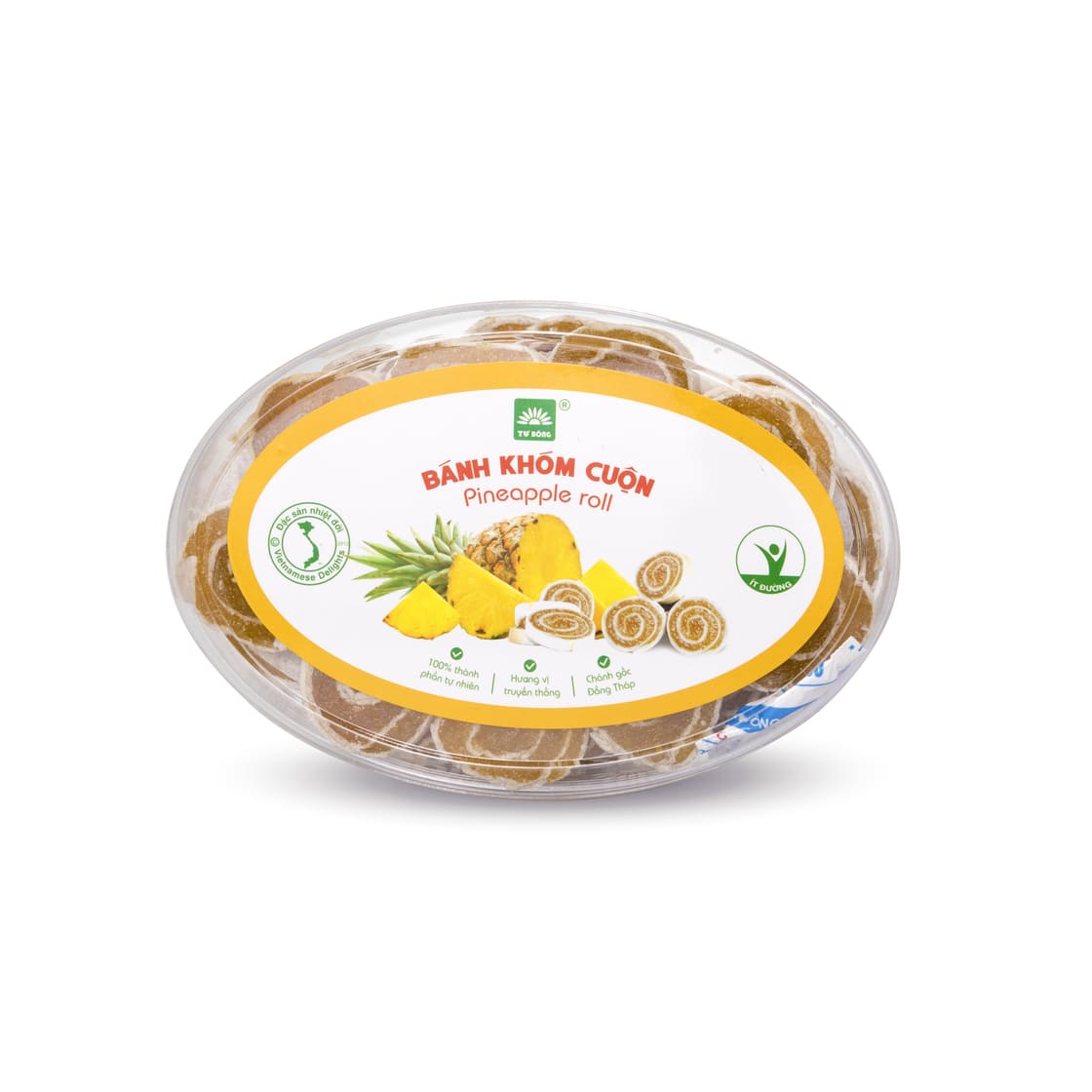 Bánh khóm (dứa) cuộn thưởng thức cùng với nước trà thì ngon không thể tả. Ngay miếng bánh đầu tiên đã cảm nhận được vị thơm, giòn, ngọt đậm đà trong khoang miệng rồi. Team thích vị khóm thì order ngay nếu không muốn bỏ qua một siêu phẩm của mứt khóm nhé.